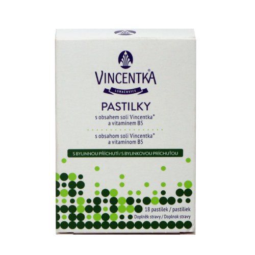 Vincentka pastilky s bylinnou příchutí - potravina pro zvláštní výživu, doplněk stravy. Produkt z minerální vody Vincentka. Přípravek Vincentka pastilky je nová forma v užívání přírodních solí Vincentky. Složení Sůl Vincentka z přírodní minerální vody Vincentka, sorbitol, pantothean vápenatý, mastek, stearan hořečnatý, bylinné aroma přírodně identické. Případná změna barvy (nažloutlá, mírně kropenatá) není závadou výrobku. Výživové hodnoty výrobku v jedné pastilce o průměrné hmotnosti 1200 mg: Energetická hodnota 17,9 kJ, tj. 4,3 kcal Sacharidy 1,078 g Bílkoviny 0 g Tuky 0,006 g Sůl Vincentka 30 mg Pantothean vápenatý 6 mg (tj. 92% DDD kyseliny pantothenové) Doporučené denní dávkování Podle potřeby, nejvýše však 8 pastilek denně, rozpouštět zvolna v ústech. Upozornění Vhodné pro děti od 3 let. Nadměrná konzumace může vyvolat projímavé účinky. Výrobek je nevhodný pro osoby s omezeným příjmem solí. není určeno jako náhrada pestré stravy. Nepřekračujte doporučené denní dávkování. Uchovávejte mimo dosah dětí! Balení 18 pastilek Zdroj: http://www.vincentka.cz