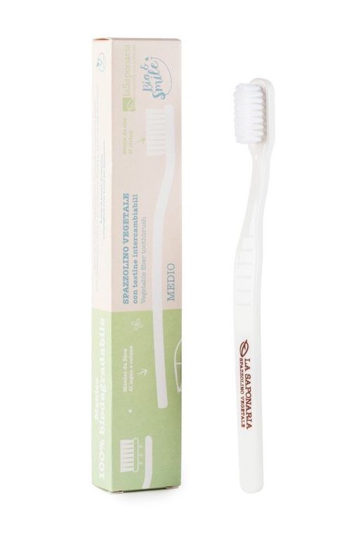LaSaponaria Zubní kartáček medium je vyroben z přírodních materiálů, má vyměnitelnou hlavici se štětinkami střední tvrdosti a pevnou dobře padnoucí rukojeť.