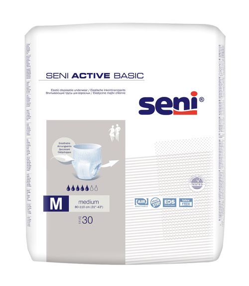Seni Active Basic Medium inkontinenční plenkové kalhotky pro osoby se středním stupněm inkontinence. Kalhotky nabízí komfort a diskrétní provedení.