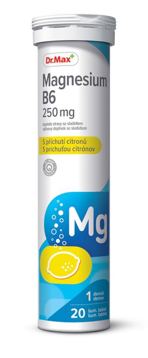 Dr.Max Magnesium B6 250 mg citron jsou šumivé tablety s obsahem hořčíku a vitaminu B6 pro snížení míry únavy a vyčerpání a správný energetický metabolismus. S příchutí citrónů.