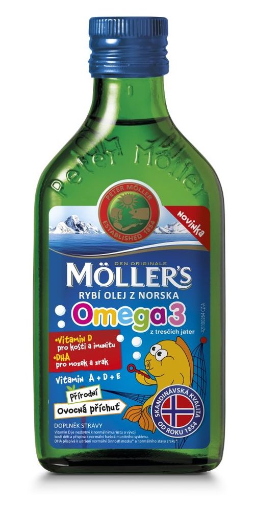 Möller's Omega 3 Ovocná příchuť je doplněk stravy obsahující rybí olej z norské přírody. Je vyráběn tradičním způsobem z tresčích jater volně žijící tresky arktické. Je bohatým zdrojem Omega 3 (EPA, DHA), vitaminu A, D a E. Příjemná ovocná příchuť pro děti. DHA přispívá k udržení normální činnosti mozku a normálního stavu zraku. Příznivého účinku se dosáhne při přívodu 250 mg DHA denně. EPA a DHA přispívají k normální činnosti srdce. Příznivého účinku se dosáhne při přívodu 250 mg EPA a DHA denně. Vitamin D je nezbytný k normálnímu růstu a vývoji kostí dětí. Vitamin D přispívá k udržení normálního stavu kostí a zubů. Vitaminy A a D přispívají k normální funkci imunitního systému. Vitamin A přispívá k udržení normálního stavu zraku a pokožky. Vitamin E přispívá k ochraně buněk před oxidativním stresem. Jak užívat Möller's Omega 3 Ovocná příchuť: Dospělí a děti od 3 let užívají 5ml (čajová lžička) denně. Složení: Rybí olej z jater tresky, přírodní aromata, DL-alfa-tokoferyl-acetát (vitamin E), antioxidant (extrakt s vysokým obsahem tokoferolů). Obsah účinných látek v denní dávce (5 ml) Omega-3 mastné kyseliny1200 mg z toho EPA 400 mg a DHA 600 mg, Vitamin E 10 mg, Vitamin A (retinyl-palmitát) 250 µg, Vitamin D (cholekalciferol) 10 µg. Upozornění: Nepřekračujte doporučené denní dávkování. Neslouží jako náhrada pestré stravy. Určeno dětem od 3 let. Dbejte na různorodou a vyváženou stravu a zdravý životní styl. Uchovávejte mimo dosah dětí!