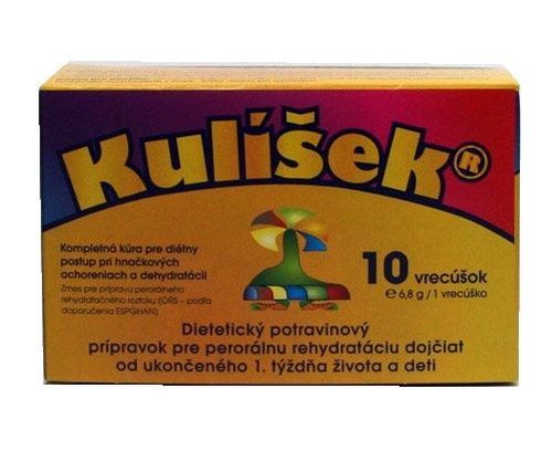 Instantní směs pro přípravu perorálního rehydratačního roztoku (ORS – podle doporučení ESPGHAN) pro kojence a děti od ukončeného 1. týdne života při průjmových potížích, zvracení a horečce. Složení Glukóza, chlorid sodný, citronan sodný, chlorid draselný. Upozornění Dietní potravina pro zvláštní lékařské účely pro kojence a děti od ukončeného 1. týdne života. Použití doporučuje lékař nebo osoba kvalifikovaná v oblasti výživy, farmacie nebo péče o matku a dítě. Dávkování a způsob užití 1 sáček rozpustíme ve 250 ml převařené kojenecké vody a vychladíme. Podáváme z láhve, hrnečku nebo po lžičkách. Balení 10 sáčků. Zdroj: www.kulisek-ors.cz